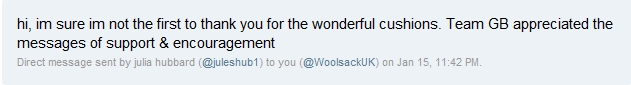 Woolsack has received some lovely messages of thanks from some of the athletes, teams & Games organisers. Also some makers have passed on to us messages that they have received personally from the recipient of their cushion.